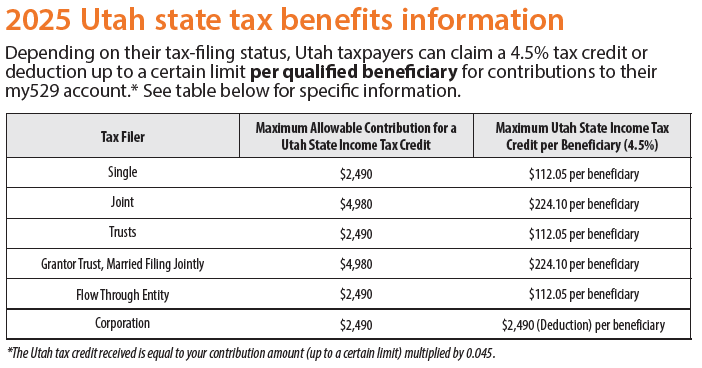 Depending on their tax-filing status, Utah taxpayers can claim a 4.5% tax credit or deduction up to a certain limit per qualified beneficiary for contributions to their my529 account. (The Utah tax credit received is equal to your contribution amount, up to a certain limit, multiplied by 0.045.)